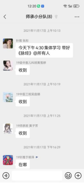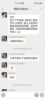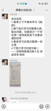 2021年春季学期要求同学们精读《医贯》,并上交读书心得,同时根据同学们的学习情况,定时进行集体研讨学习。2021年秋季学期要求同学们精读《脉经》,并上交读书心得,同时根据同学们的学习情况,定时进行集体研讨学习。希望通过读书交流一方面锻炼同学们的表达能力,同时拓宽同学们的知识面。另一方面通过解答同学们在读书过程中遇到的困惑,督促师承团队的老师们一起读书,真正起到教学相长的作用。