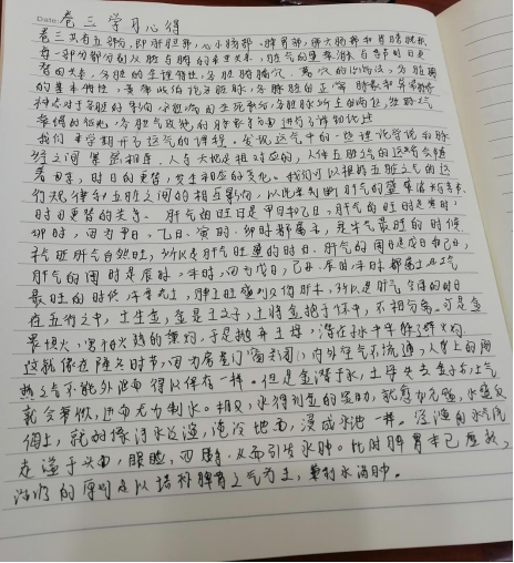 8.彭杰浩收获:中医学是一门讲究整体的学说,在分析疾病状态时却又极为详细,脉象可以分为三部九侯,病症可以分为不同的阶段,治病讲究天人相应,而这些都需要扎实的基础以及丰富的临床经验作为基础。在用药方面,要对药物功效有足够的了解,有足够细致的划分,这样才能用得足够准确,在顾及药物疗效的同时,还要顾及病人的感受。