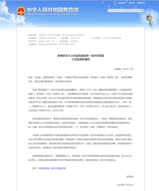 2020年11月24日,国家教育部网站发布了国家级一流本科课程认定结果的通知,公告了国家级一流本科课程名单,我院《内经选读》课程被评为国家级一流本科课程。