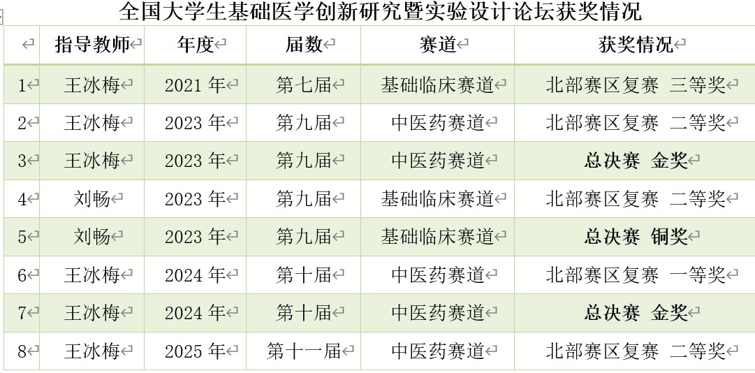 自2021年以来,教研室教师以指导学生参加学科比赛为载体,推动专业学习与创新研究的有机融合。多次指导学生参加教育部批准的白名单比赛“全国大学生基础医学创新研究暨实验设计论坛”,激发学生创造力,培养学生的科研能力。